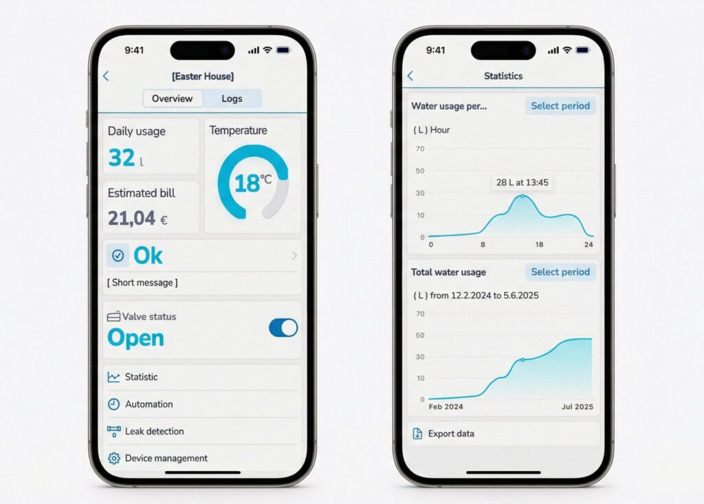 - Limit Protection: Set daily volume limits (e.g., 200L/day). If the limit is exceeded, the system alerts you or shuts off the water. *